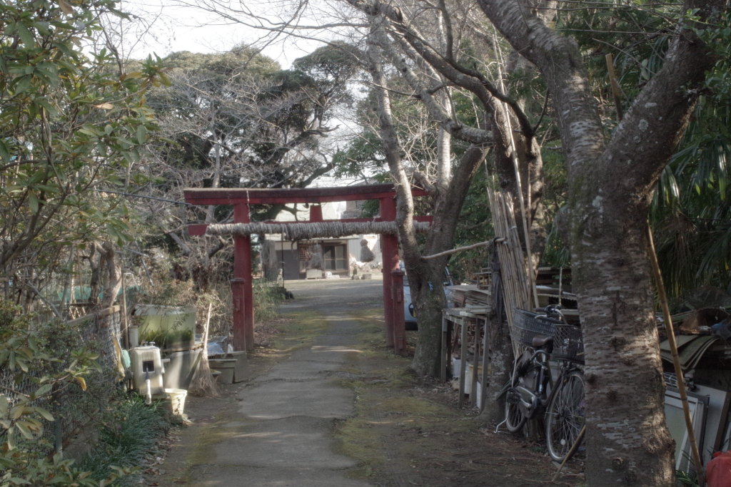 長沖新田の鎮守八坂神社の裏手に当たりますが、参道の入口はその逆方向の川原代側にあり、稲荷神社らしく朱塗りの鳥居が建っています。