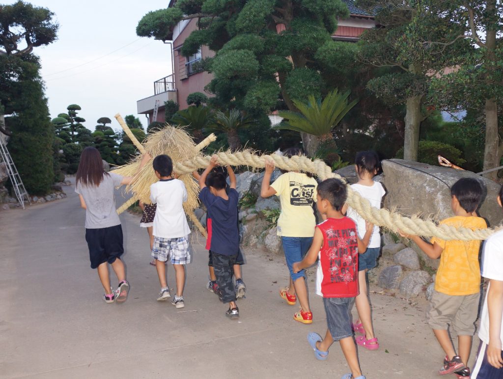 盆綱は、茨城・千葉両県の一部地域で行われ、地域の子どもたちが藁で龍を模った綱を作って、お墓から祖先の霊を各家に送り届けるという盆行事である。千秋地区においては、昭和55年から途絶えていたが、平成13年から有志により復活。少子化の影響もあり、現在では宮渕町内の他地区の子どもたちにも参加してもらい、行事を継続している。当市内においては唯一、同地区でのみ実施されていることから,盆綱作りの手順の継承等、存続が望まれる伝統行事である。(龍ケ崎市公式HPより)