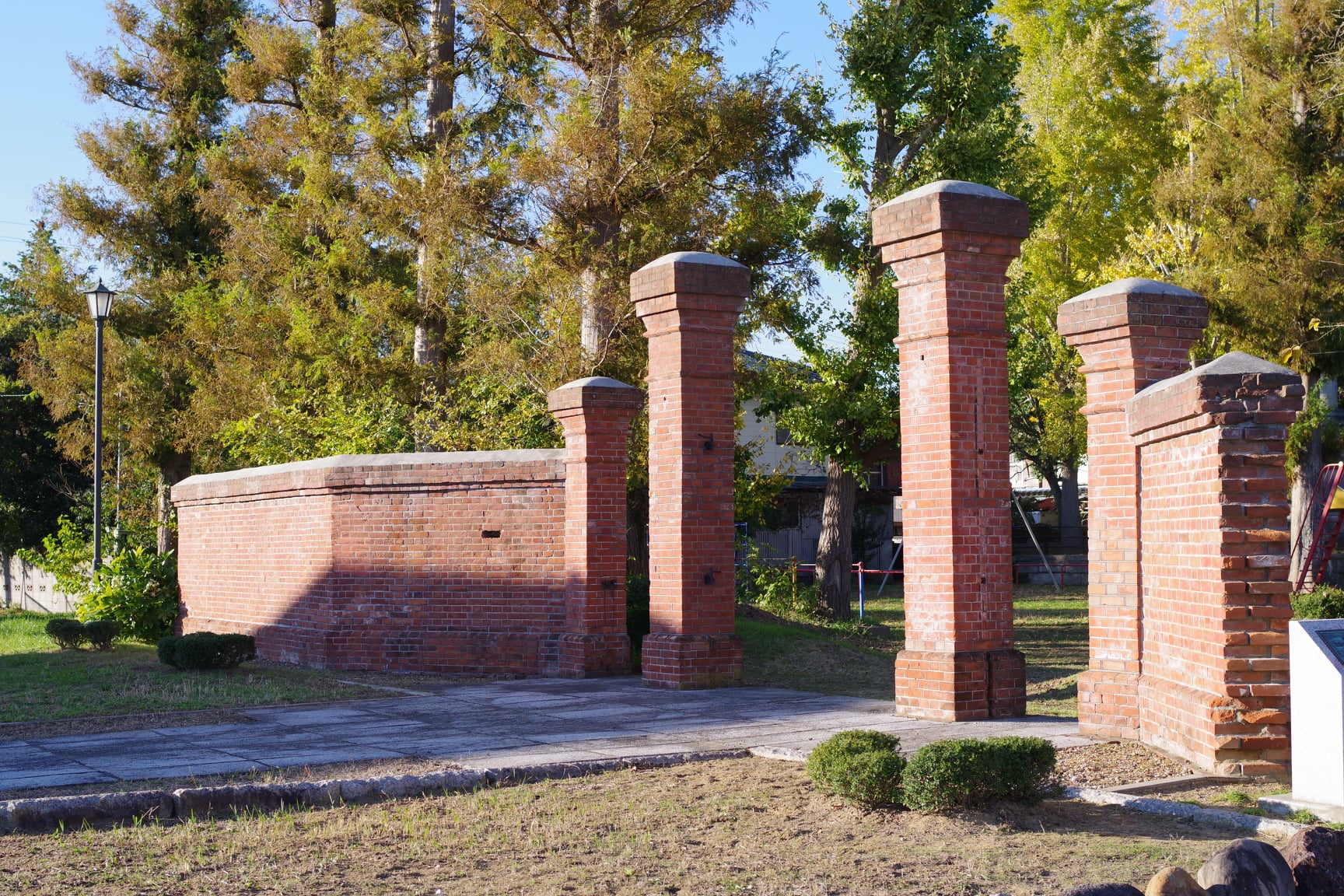 明治末、龍ケ崎市米町の諸岡良佐(もろおかりょうすけ)氏が自宅に建てた赤レンガ門塀で、移築前は、7000㎡の敷地をぐるりとレンガ塀で囲んでいて、大柱の高さ3.8メートルと、個人邸洋風煉瓦門塀として、全国的にも特筆される規模でした。門柱4本のデザインも秀逸で、東京駅と同じ覆輪目地(フクリンメジ)で施工されています。レンガの積み方は主にイギリス積みで、脇柱の幹部だけがフランス積みとなっています。